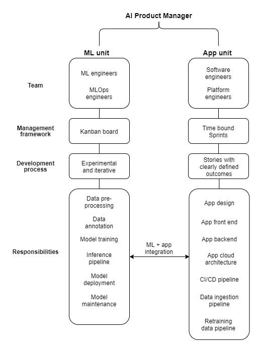 In addition to your typical application development team structure, you will need engineers dedicated to ML development and deployment. The exact number, skillset and experience depends on the project specifics. You can either have ML engineers and application developers in 2 units within a single team or as 2 separate teams. In either case, both should work parallelly but certainly not in silos. A single PM should own the outcome of the entire ML feature and act as a bridge between the two units/teams to ensure everyone is on the same page and easily able to easily integrate their code.