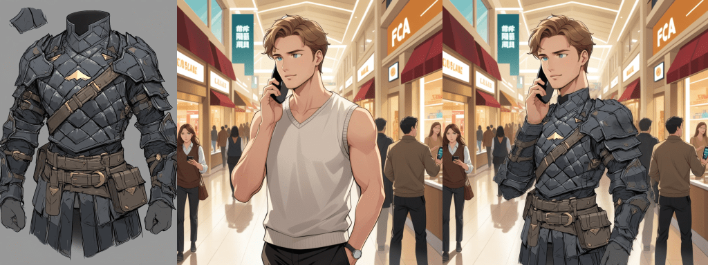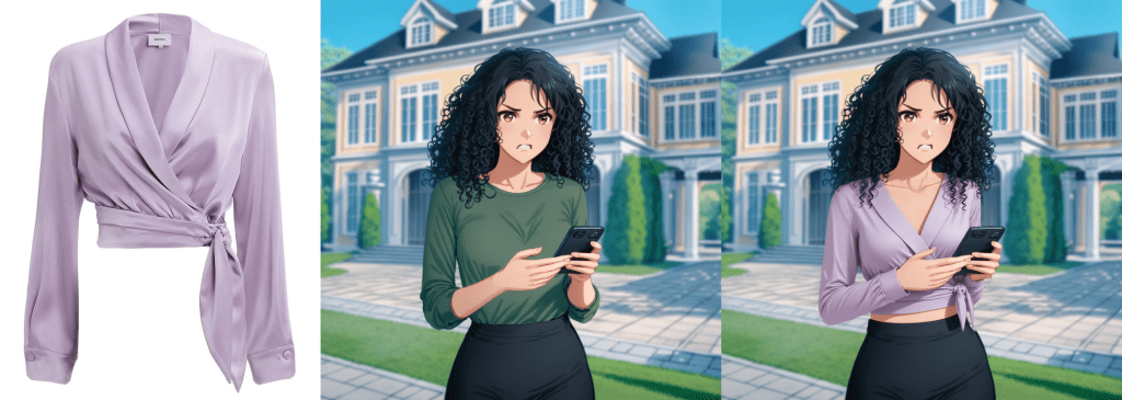 While making comics using generative AI, achieving consistency in clothing and specific objects across panels is essential. It’s easier to do with characters and art style by using LoRAs. But it’s impractical to train a LoRA for clothing because using too many concept LoRAs together creates unwanted artefacts. A character may might wear different outfits in different scenes, so generating the clothing as a part of the character by including it consistently in every image of the LoRA dataset isn’t practical either. We needed a method to upload an image of clothing or an object and transfer it seamlessly into the target image.
