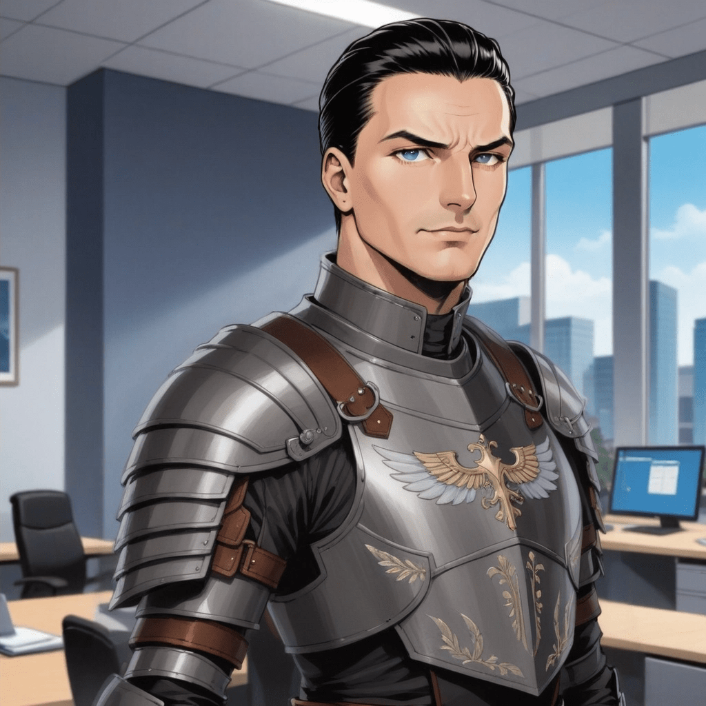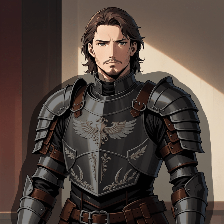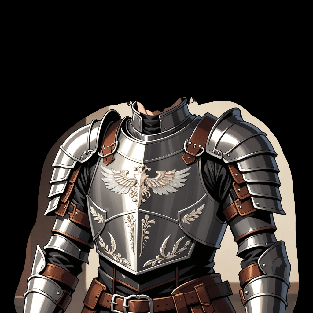 Metallic plate armor with intricate designs, including a winged emblem on the chest. Brown leather straps and accents secure the armor, complemented by layered pauldrons and arm guards.
